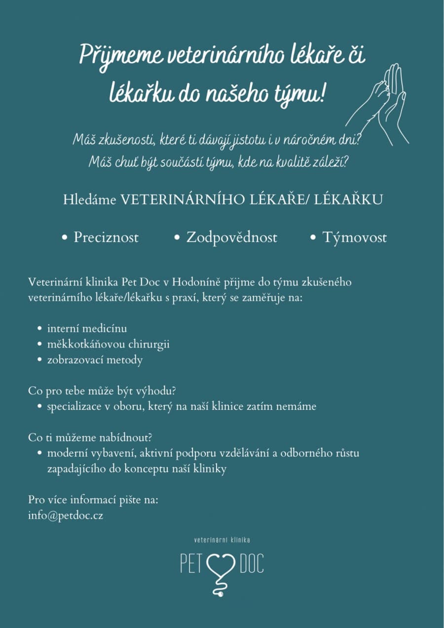 Veterinární klinika Pet Doc v Hodoníně přijme do svého týmu lékaře či lékařku se zkušenostmi v praxi malých zvířat - interní diagnostice a měkkotkáňové chirurgii.