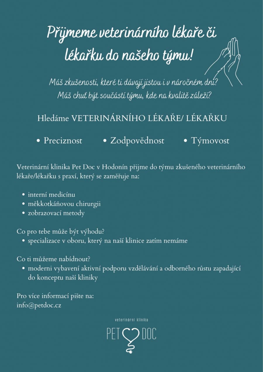 Veterinární klinika Pet Doc v Hodoníně přijme do svého týmu veterinárního lékaře či lékařku se zkušenostmi v praxi malých zvířat.