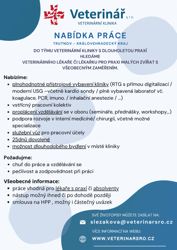 Do týmu veterinární kliniky s dlouholetou praxí a se zavedenou klientelou, hledáme veterinárního lékaře či lékařku pro praxi malých zvířat s všeobecným zaměřením.
