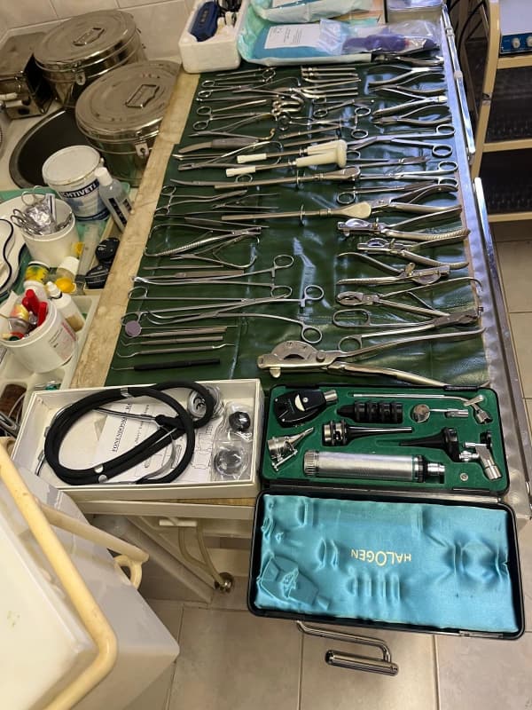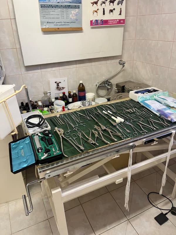 Veterin. stavitelny, vysetrovaci stul, Veterin. nastroje, elektrokauter, mikroskop, opht. endo skop set, stolek na nastroje, ctecka cipu