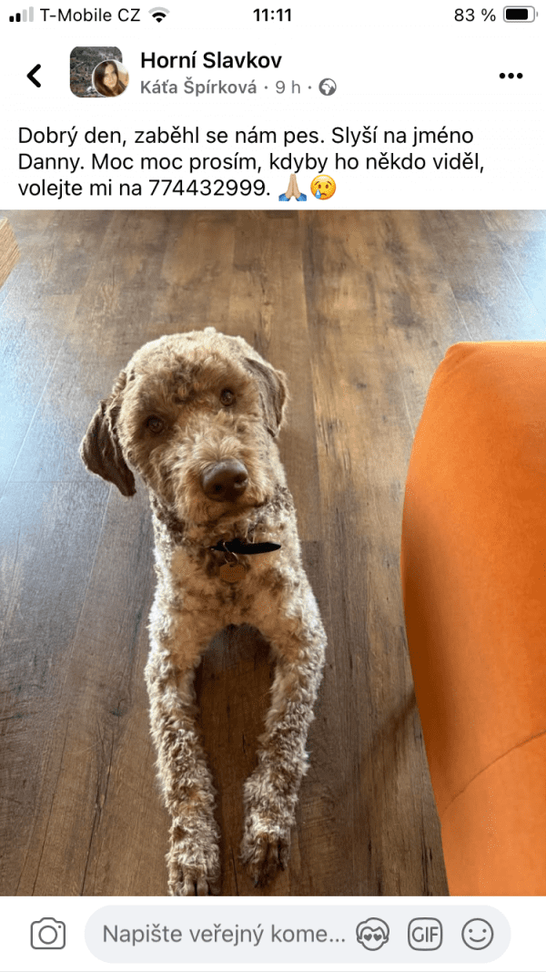 Dobrý den, prosím o pomoc při hledání psa mé klientky - plemeno Italský vodní pes, jméno Danny, 1 rok starý, barva hnědo-bílá.