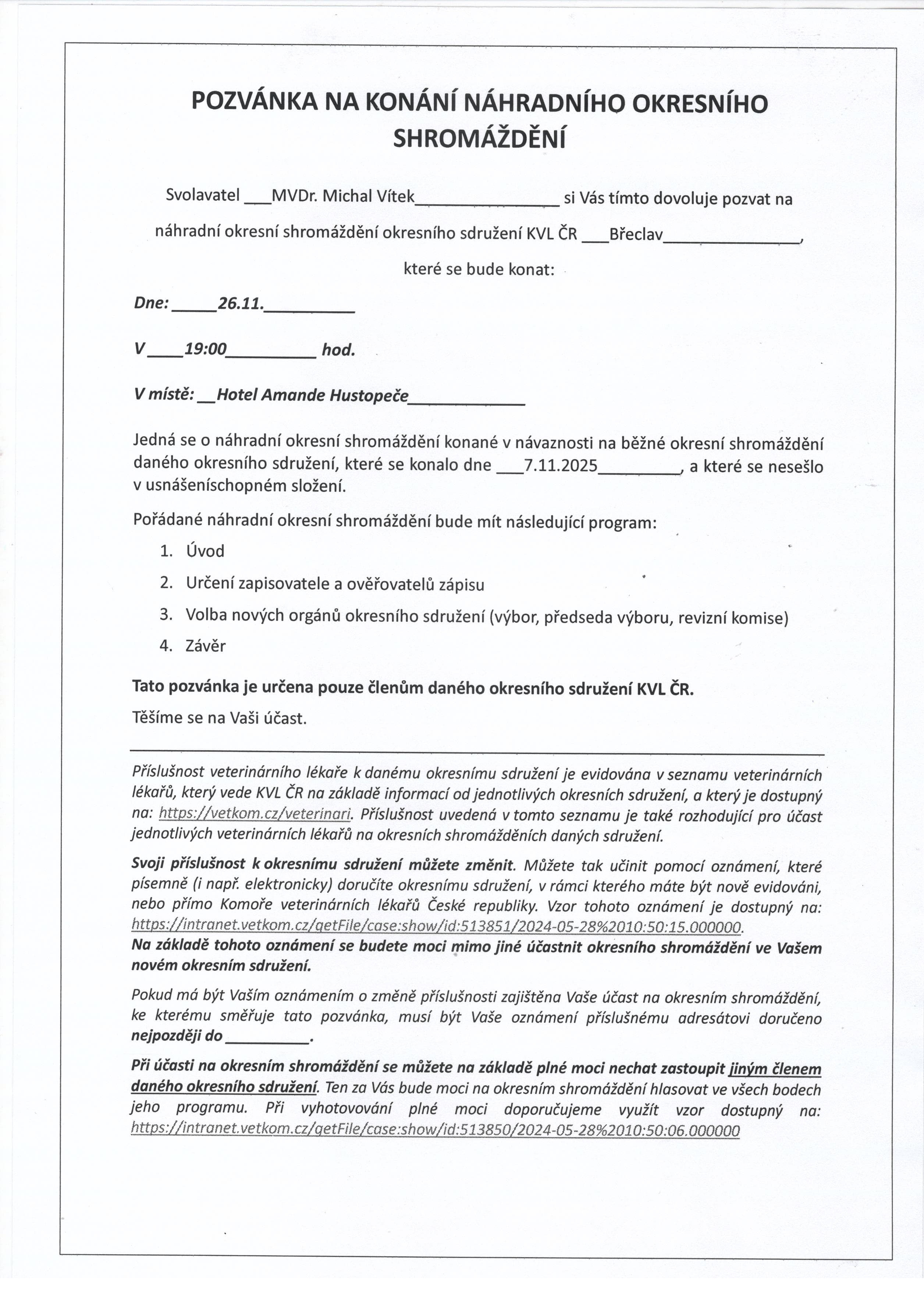 Svolavatel MVDr. Michal Vítek si Vás tímto dovoluje pozvat na