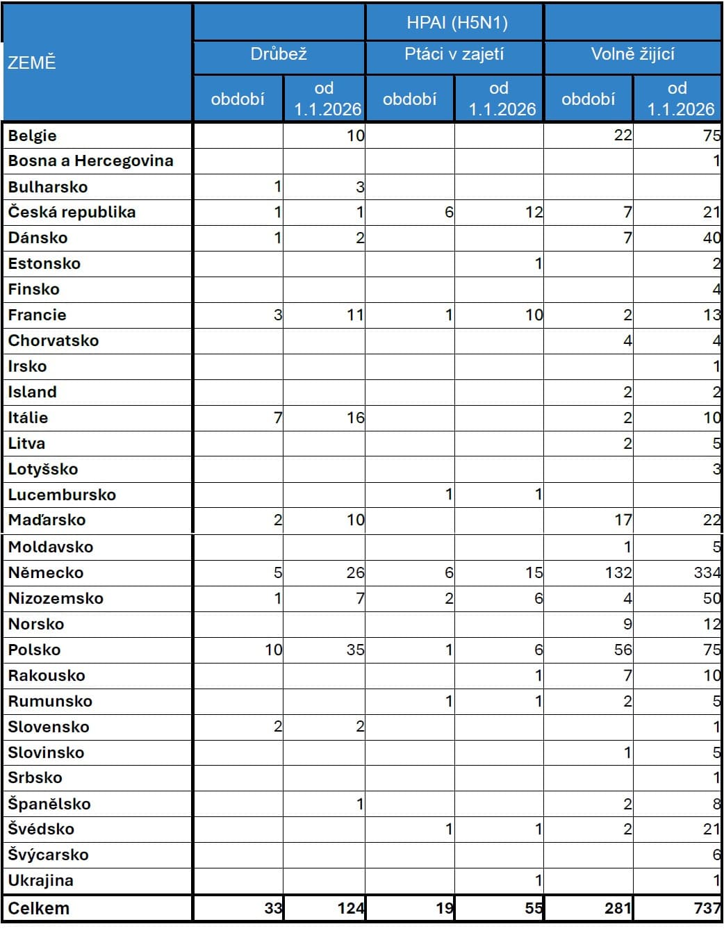 V období 1.- 12. 2. 2026 bylo do ADIS nahlášeno 33 ohnisek vysoce patogenní ptačí chřipky (HPAI) H5N1 v chovech drůbeže. U ptáků chovaných v zajetí bylo nahlášeno 19 ohnisek HPAI.