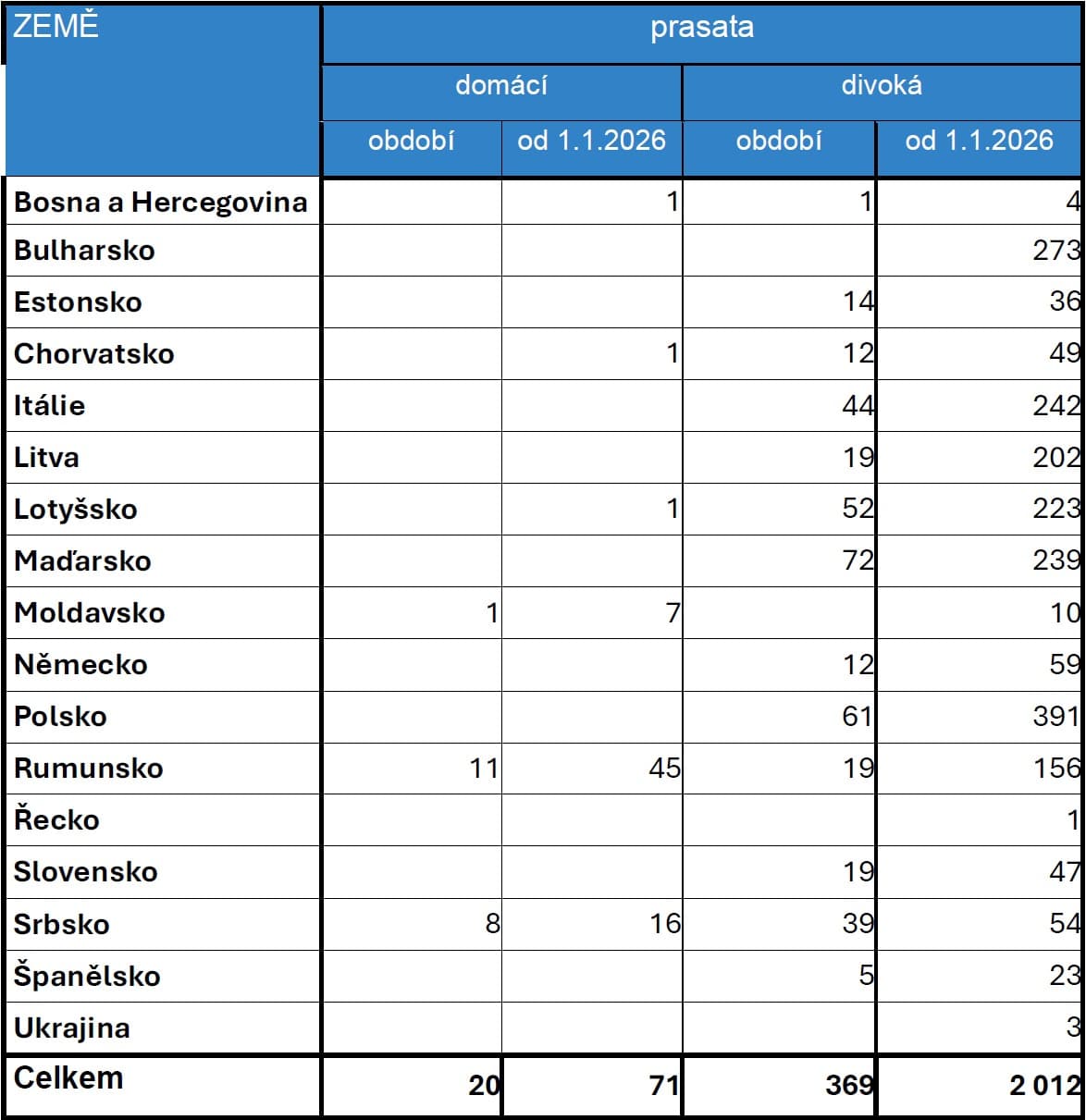 V období 1. – 12. 2. 2026 bylo v Evropě hlášeno 20 ohnisek afrického moru prasat v chovech domácích prasat.