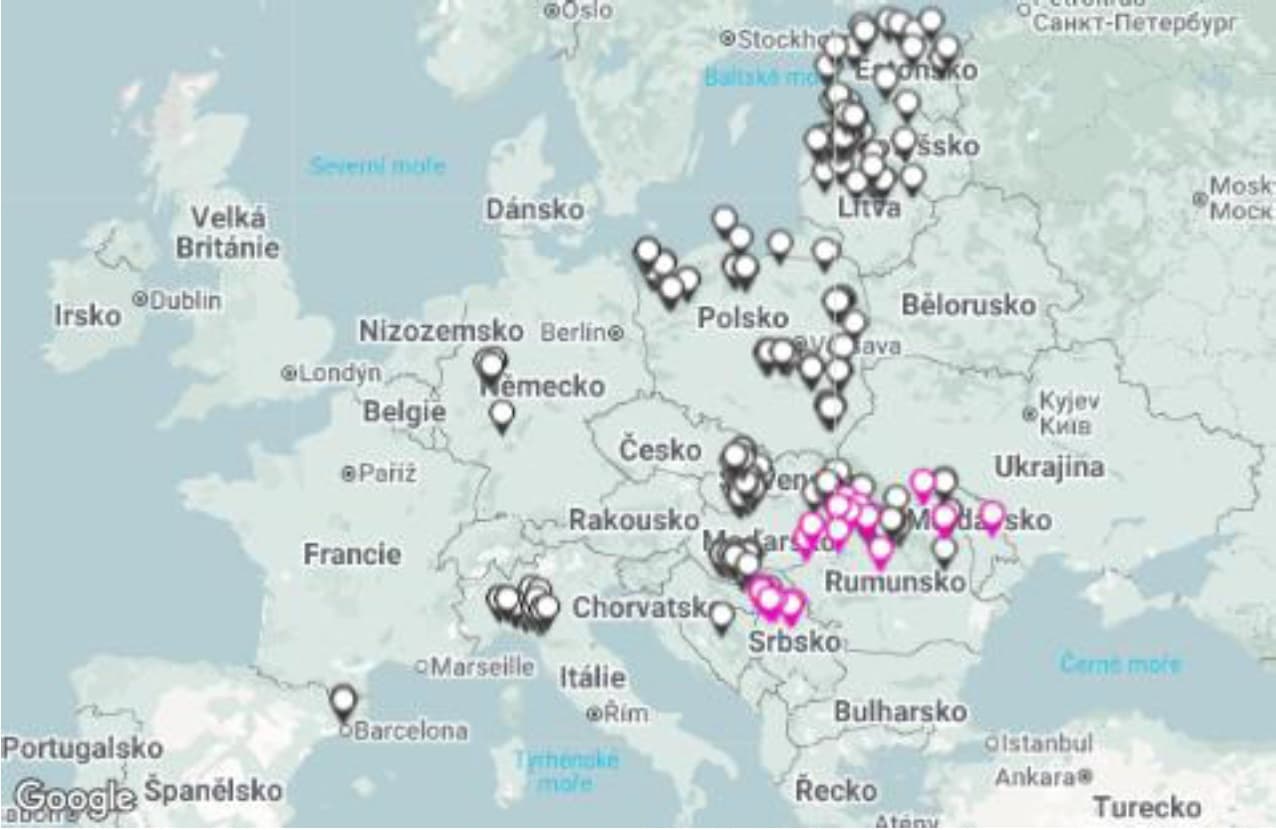 Mapa č. 2 - Ohniska AMP u domácích prasat () a případy AMP u prasat divokých () v Evropě v období 13. - 28. 2. 2026