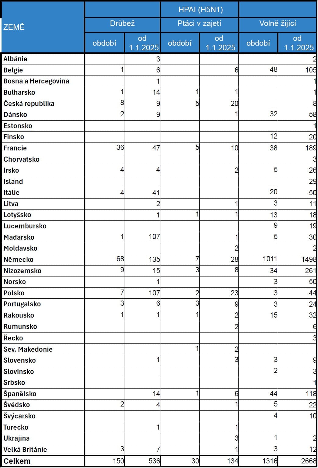 I. HPAI (Vysoce patogenní ptačí chřipka) – situace v Evropě a ČR