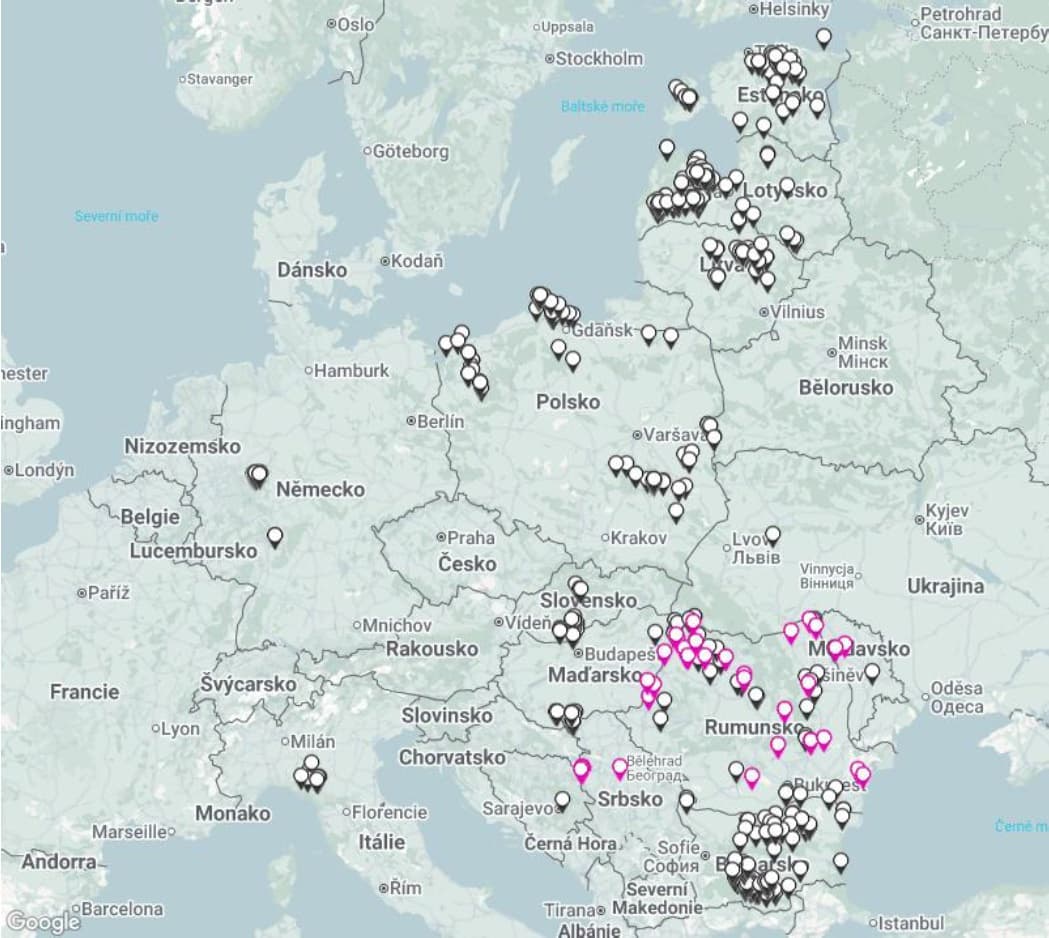 Mapa č. 8 - Ohniska vztekliny v Evropě v období 3. - 23. 11. 2025