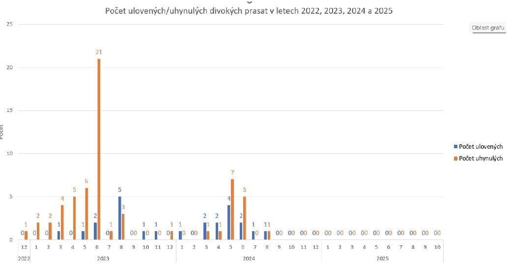 V roce 2025 zatím nebyl potvrzen žádný případ AMP, na území ČR. Celkem bylo od 1. 1. 2022 potvrzeno 85 pozitivních případů AMP u prasat divokých. Časové rozdělení případů podle měsíců vyjadřuje graf č. 1.