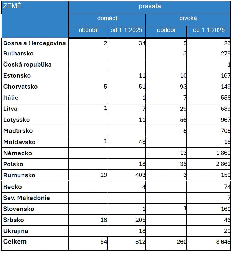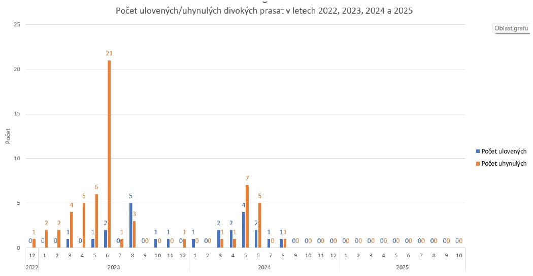 V roce 2025 zatím nebyl potvrzen žádný případ AMP, na území ČR. Za celý rok 2024 tak bylo potvrzeno 28 případů AMP u prasat divokých (13 ulovených a 15 uhynulých). Celkem bylo od 1. 1. 2022 potvrzeno 85 pozitivních případů AMP u prasat divokých. Časové rozdělení případů podle měsíců vyjadřuje graf č. 1.
