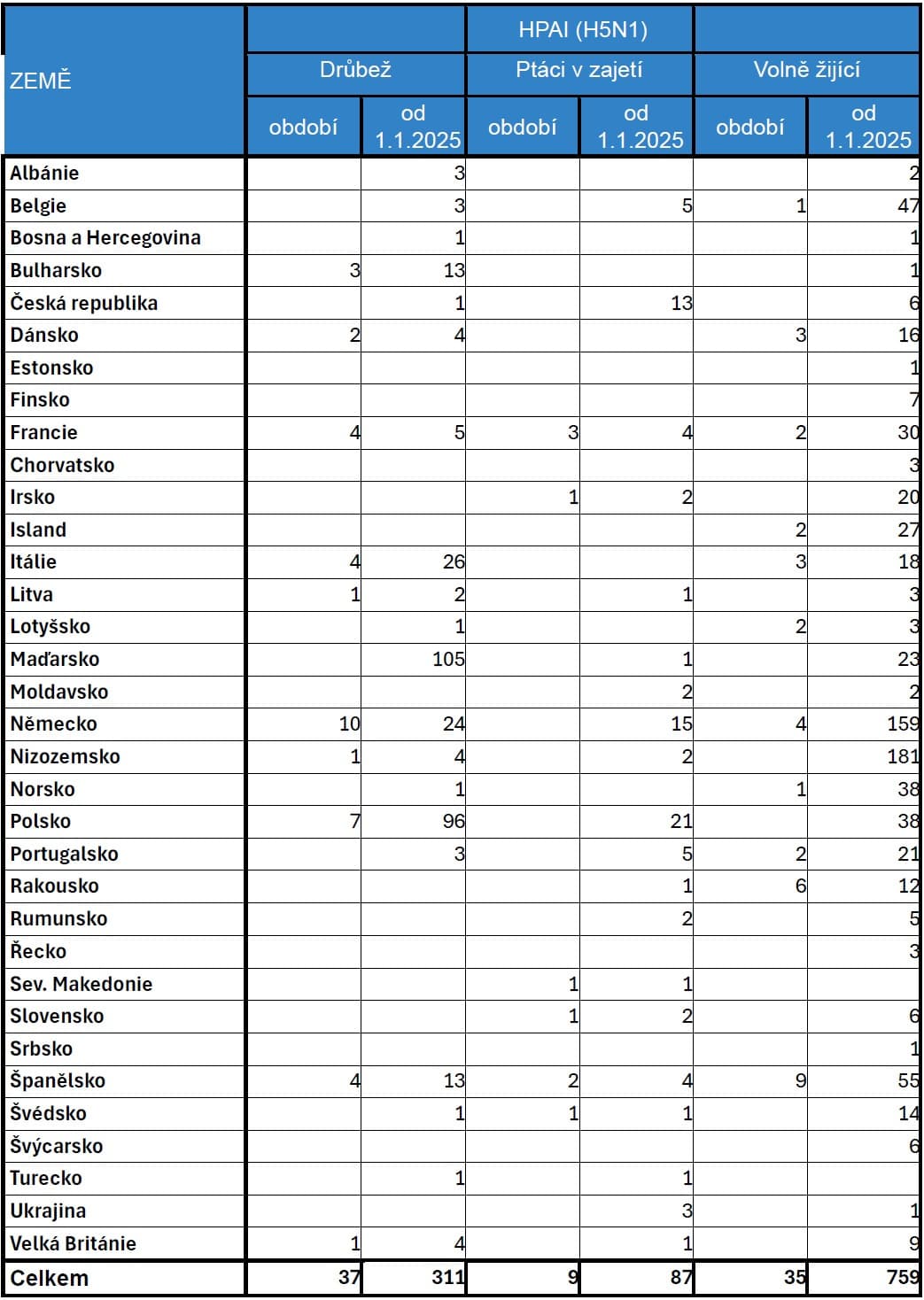 V období 6. - 19. 10. 2025 bylo do ADIS nahlášeno 37 ohnisek vysoce patogenní ptačí chřipky (HPAI) H5N1 v chovech drůbeže. U ptáků chovaných v zajetí bylo nahlášeno 9 ohnisek HPAI. V daném období bylo nahlášeno 35 pozitivních případů HPAI u volně žijících ptáků.