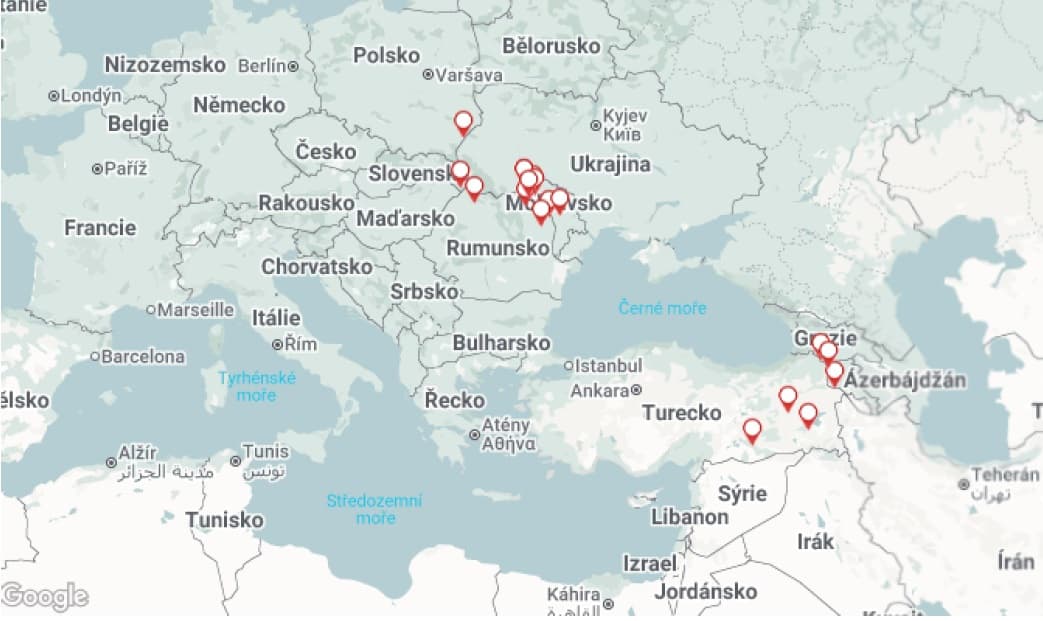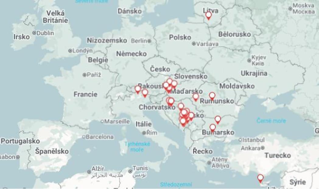 Vzteklina – 1x Maďarsko, 1x Moldavsko, 1x Polsko, 9x Rumunsko, 6x Turecko – viz mapa č. 7