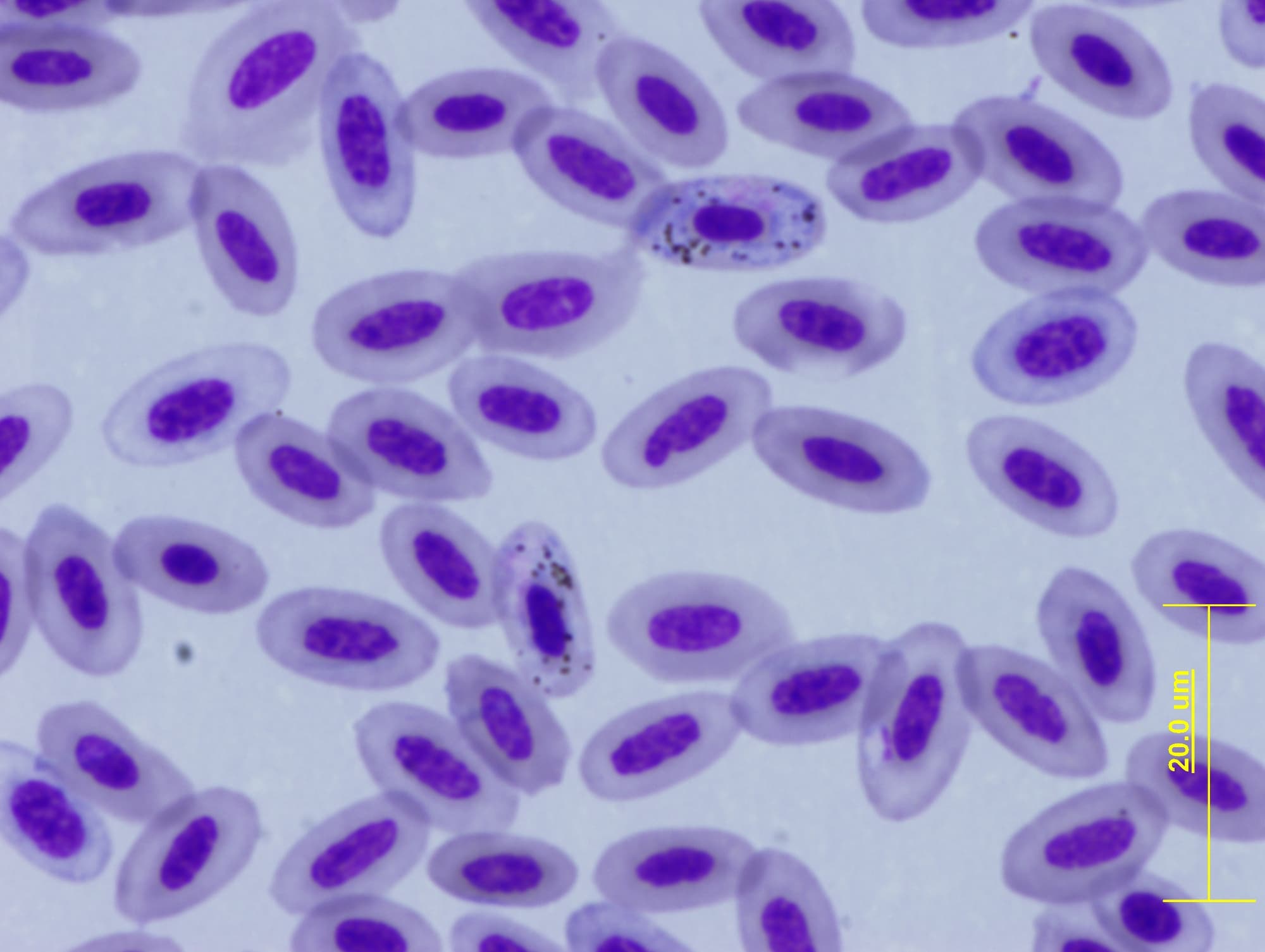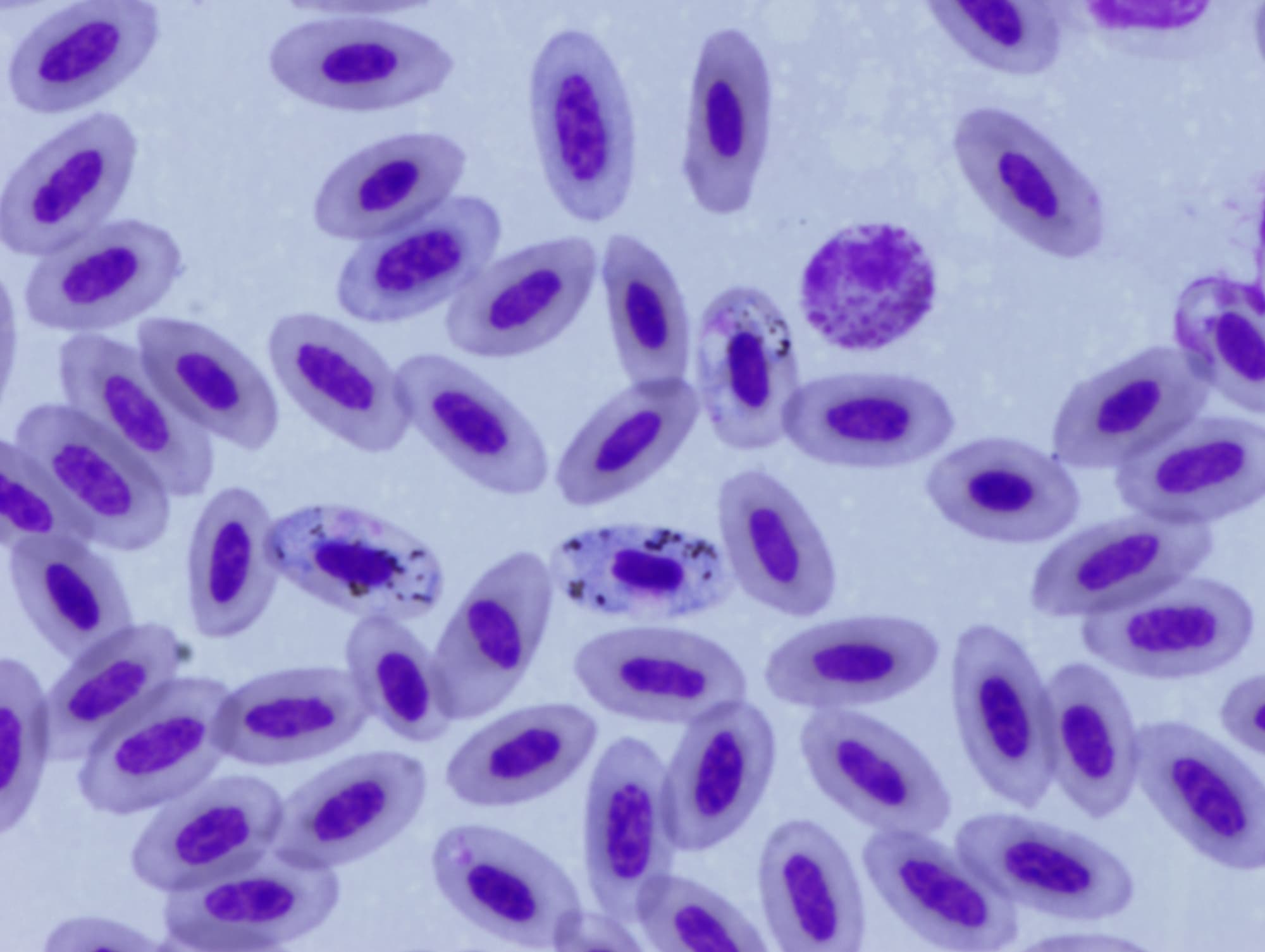 Obrázek: Haemoproteus v červených krvinkách ary zelenokřídlé.