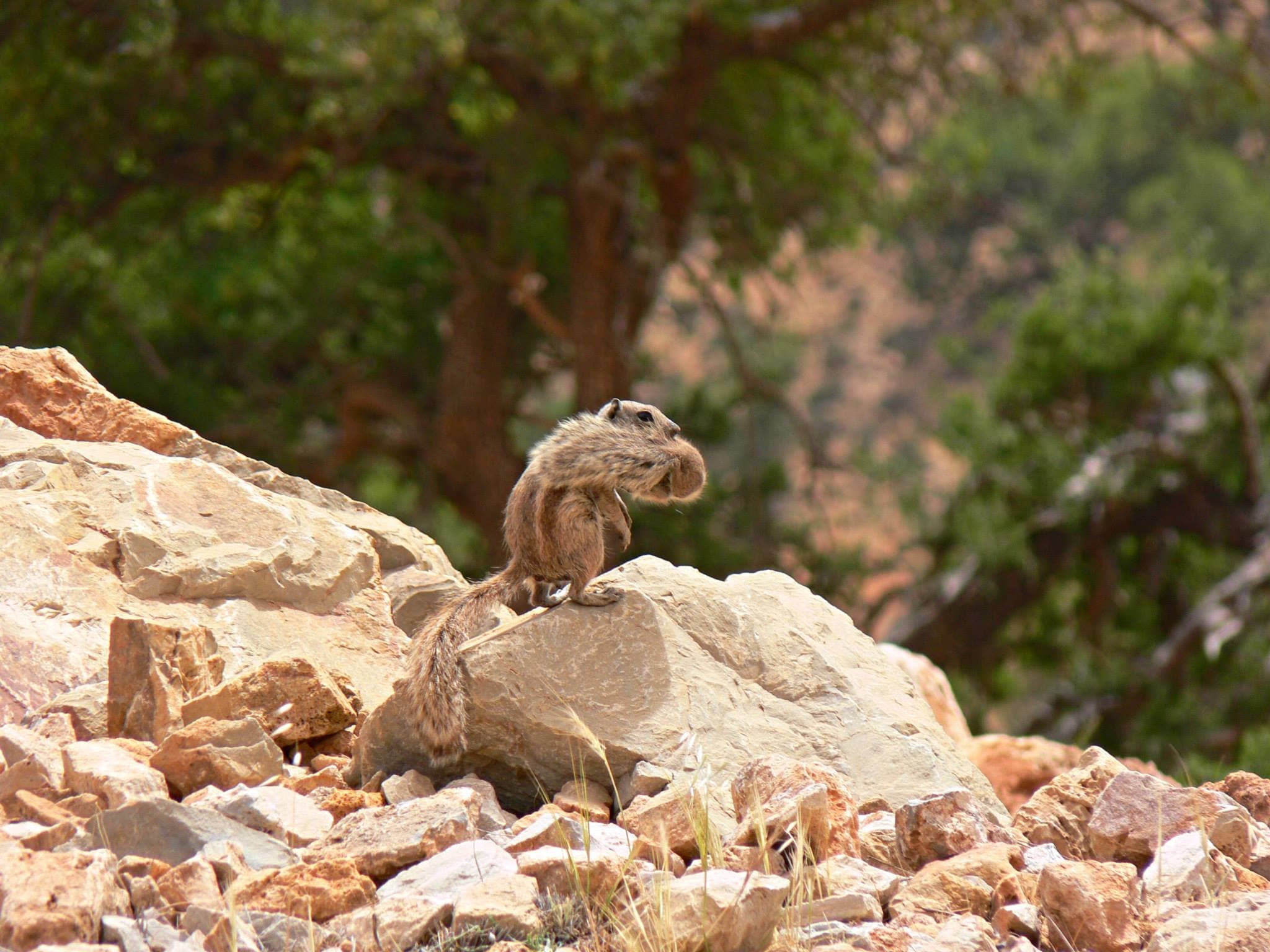 Veverka berberská (Atlantoxerus getulus) při přenášení mláděte - Jebel Toubkal 4167 m.n.m
