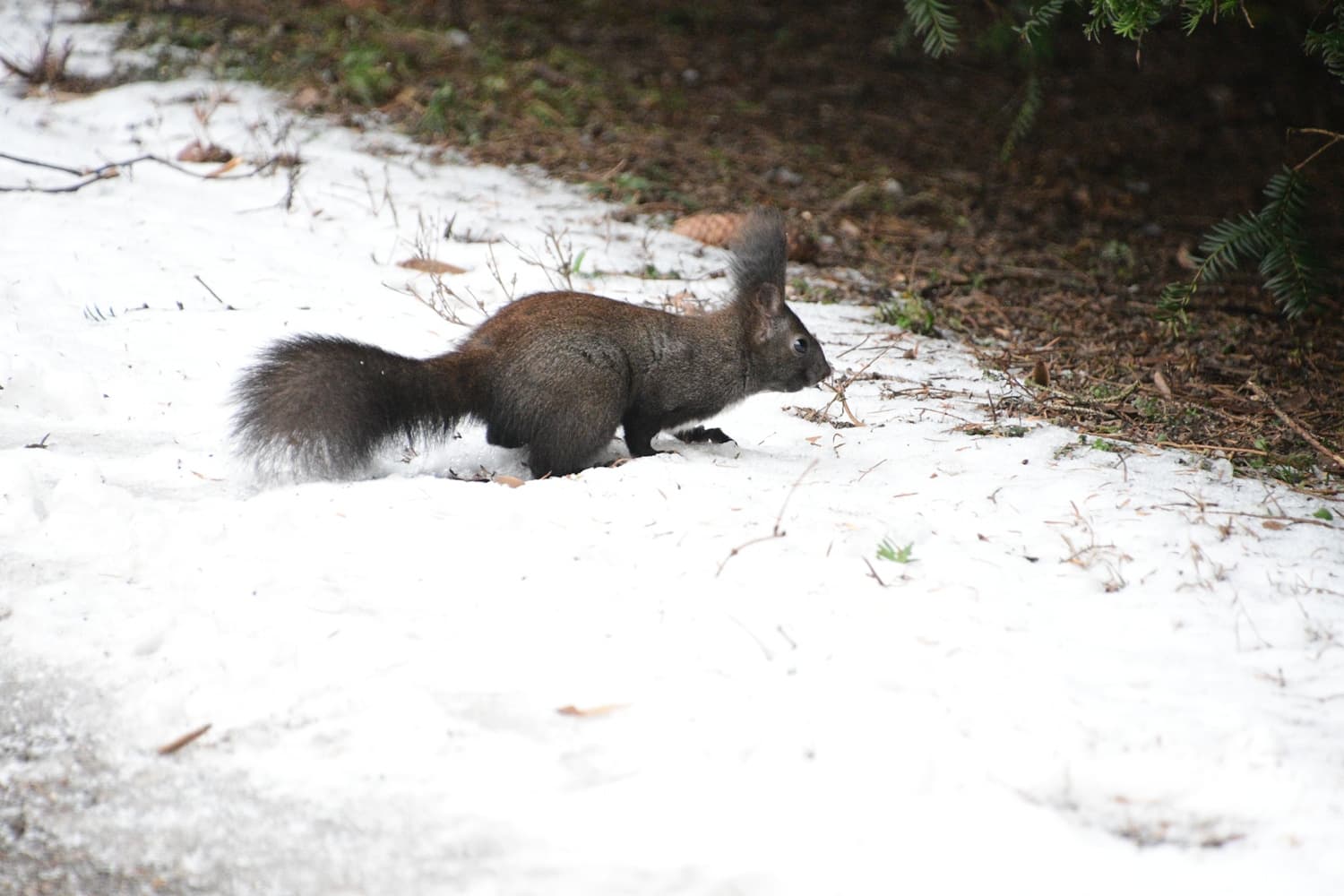 Veverka obecná (Sciurus vulgaris) tmavá forma městský park Hradec Králové